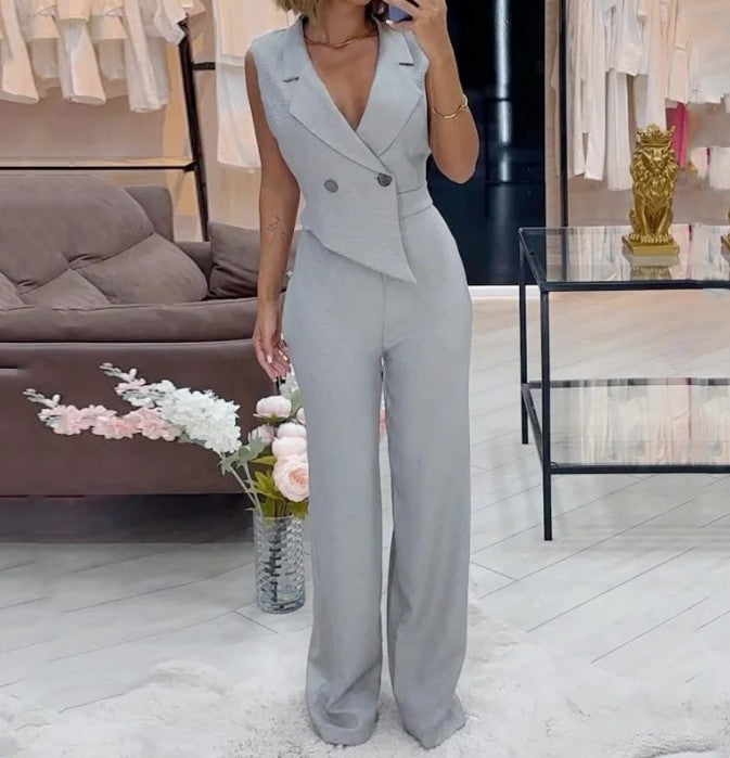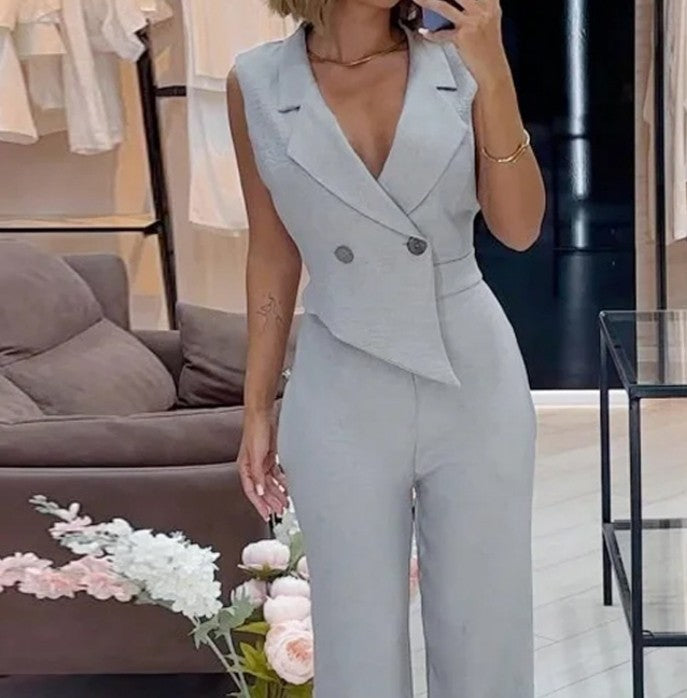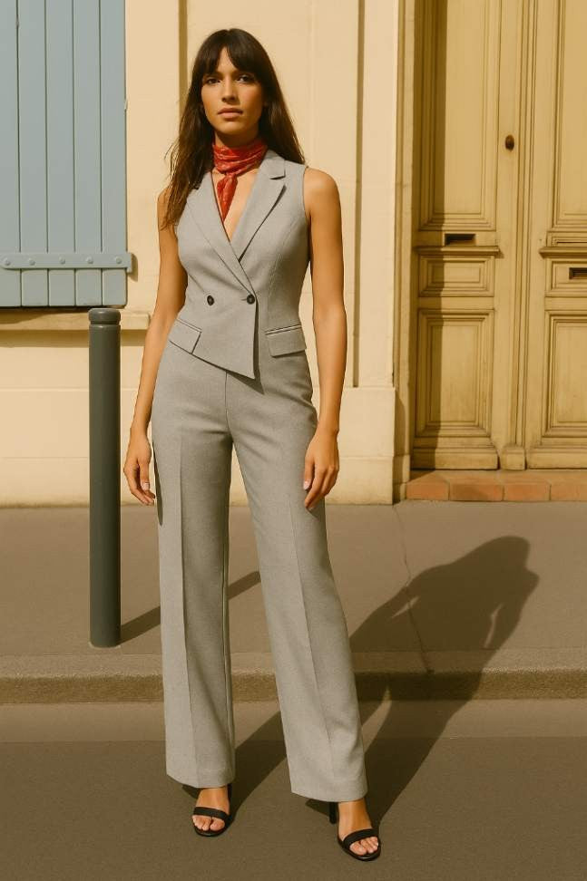 O Macacão Gabriela foi criado para mulheres que desejam transmitir conforto e confiança com praticidade. Seu design sem mangas, com gola lapela estruturada e botões frontais duplos, remete à alfaiataria clássica, mas com um toque atual e feminino.